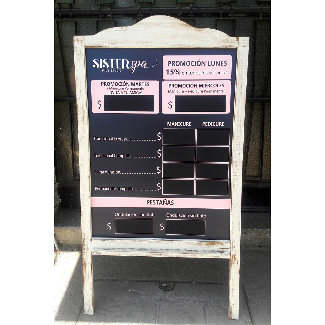El diseño lo hacemos nosotros y puede ser full color y con troqueles para que escribas informacion con tiza, por ejemplo los precios.